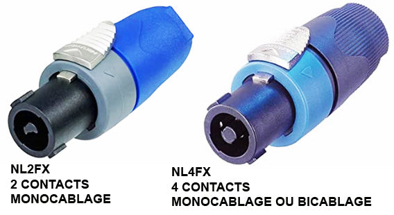 Nous utilisons le SPEAKON à 4 contacts NEUTRIK NL4FX, le plus courant. Attention le détrompeur central est différent et il est incompatible avec le SPEAKON à 2 contacts NEUTRIK NL2FX. Vous devez vérifier celui qui correspond à l'embase femelle sur vos équipements et nous préciser si nous devons utiliser le NL2FX (voir photo).